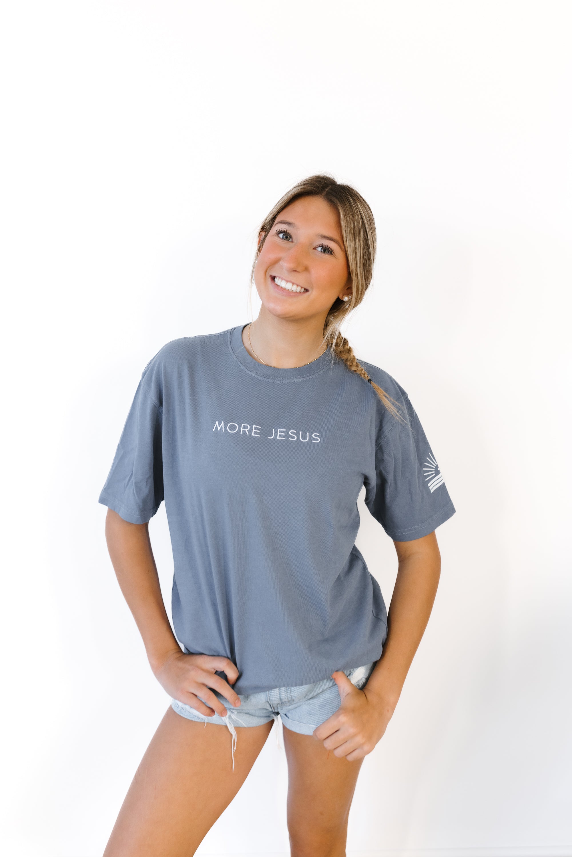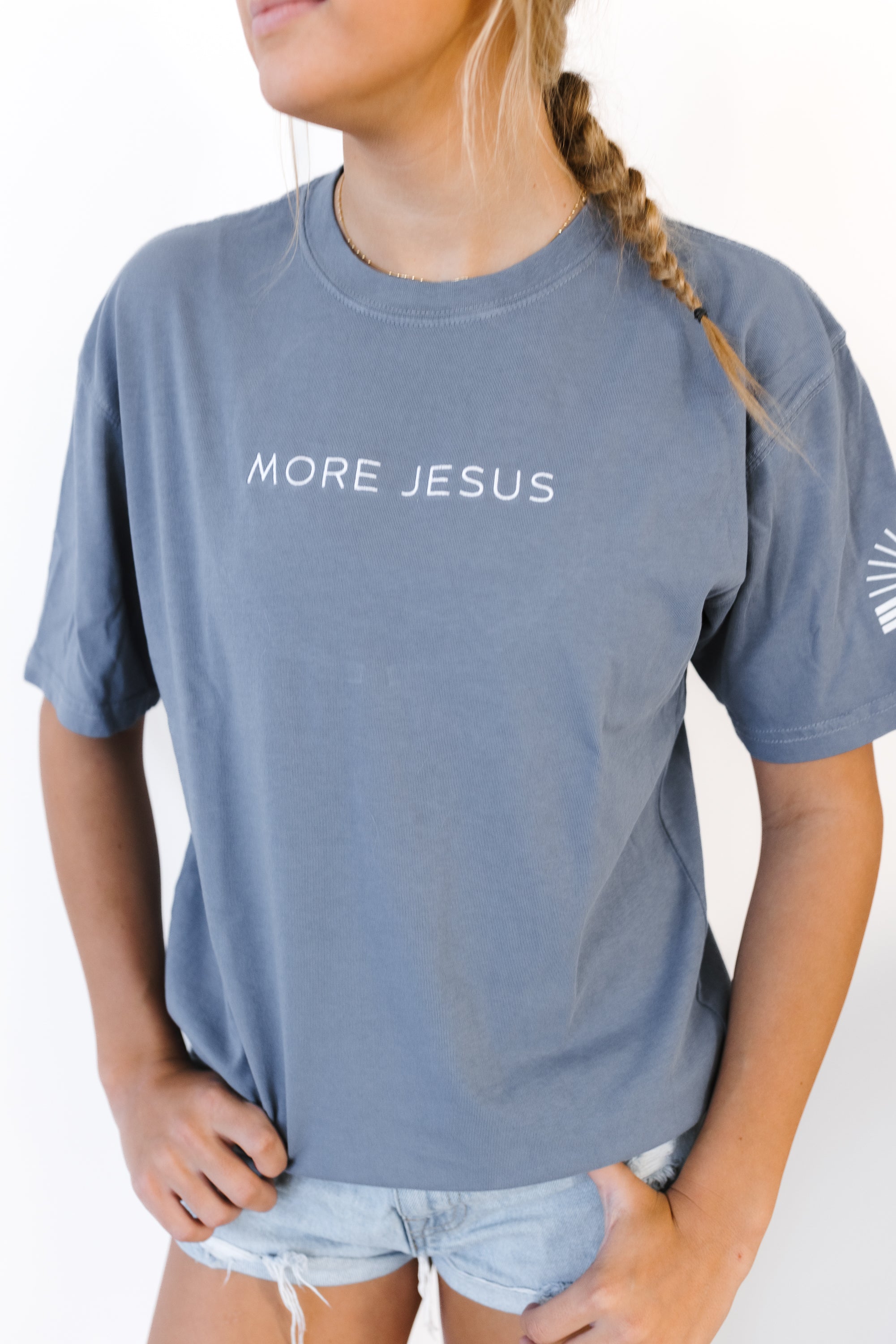 Embroidered with MORE JESUS on front in white and screen printed logo on front and sleeve.