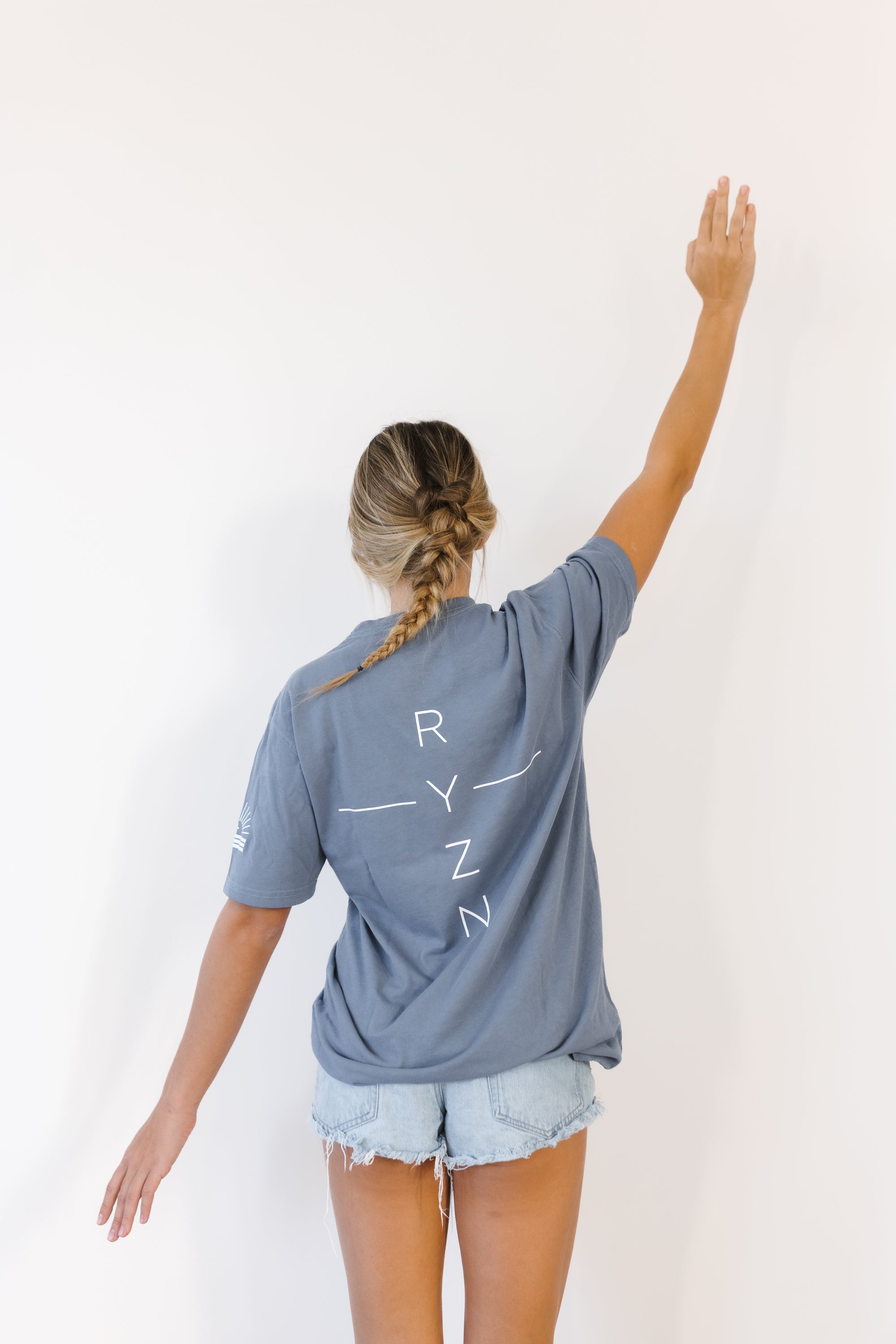 Minimal RYZN cross and sun logo in white on chest, and RYZN on bottom hem