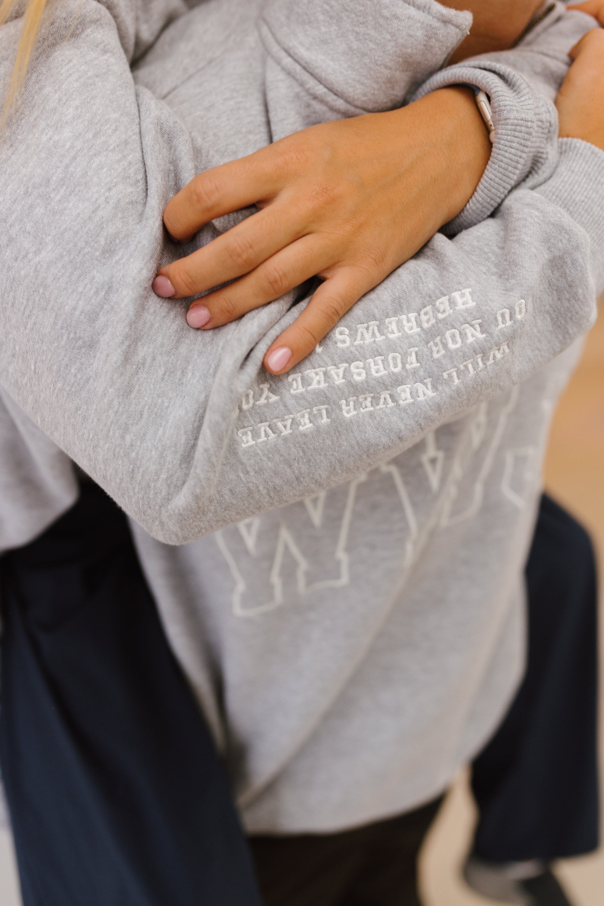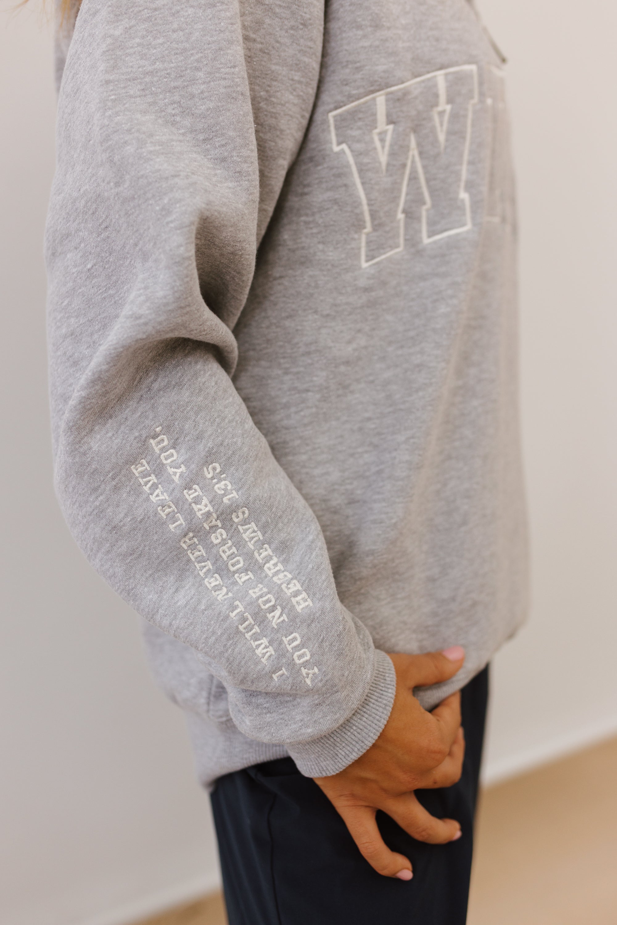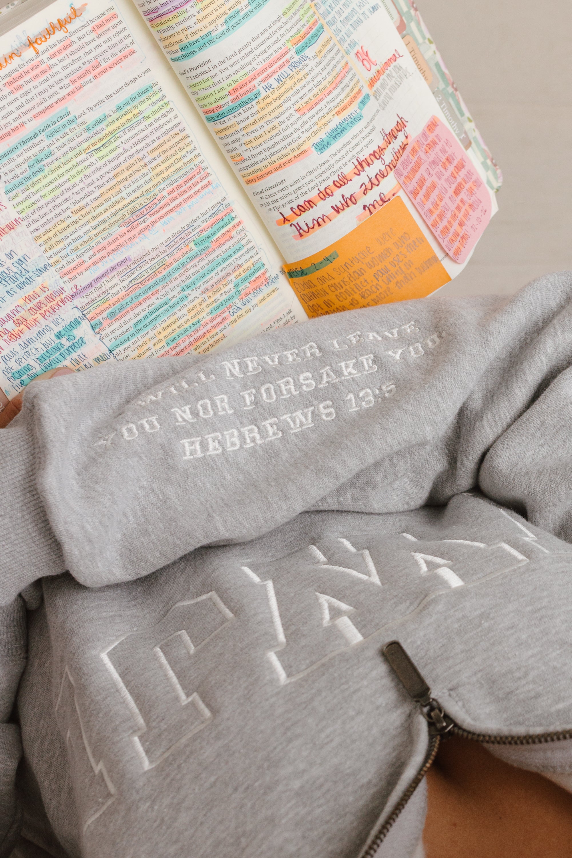 "WWJD" in white letters embroidered on front. Embroidered RYZN logo on bottom of hoodie in light blue, with a the verse "I will never leave you nor forsake you" embroidered on sleeve with HEBRREWS 13:5 below the verse.