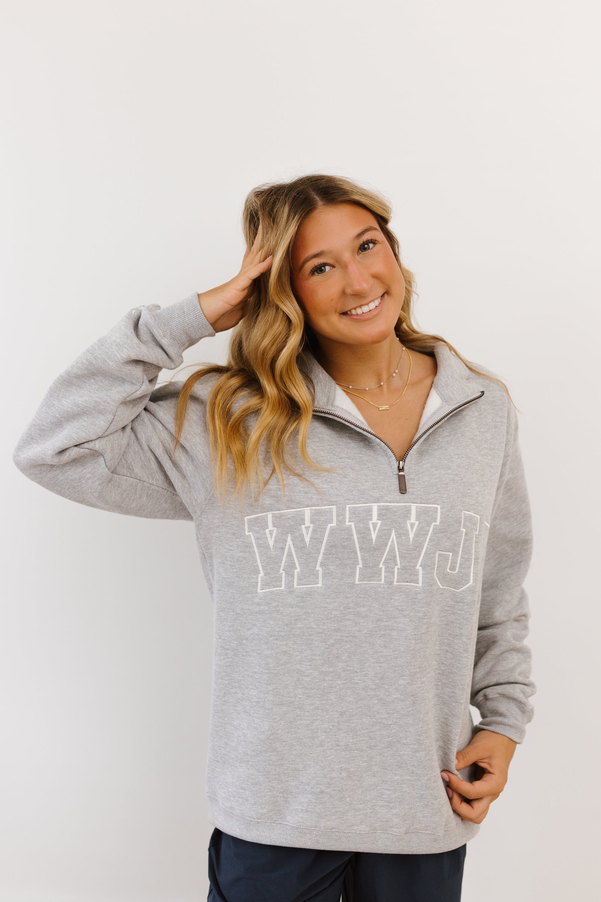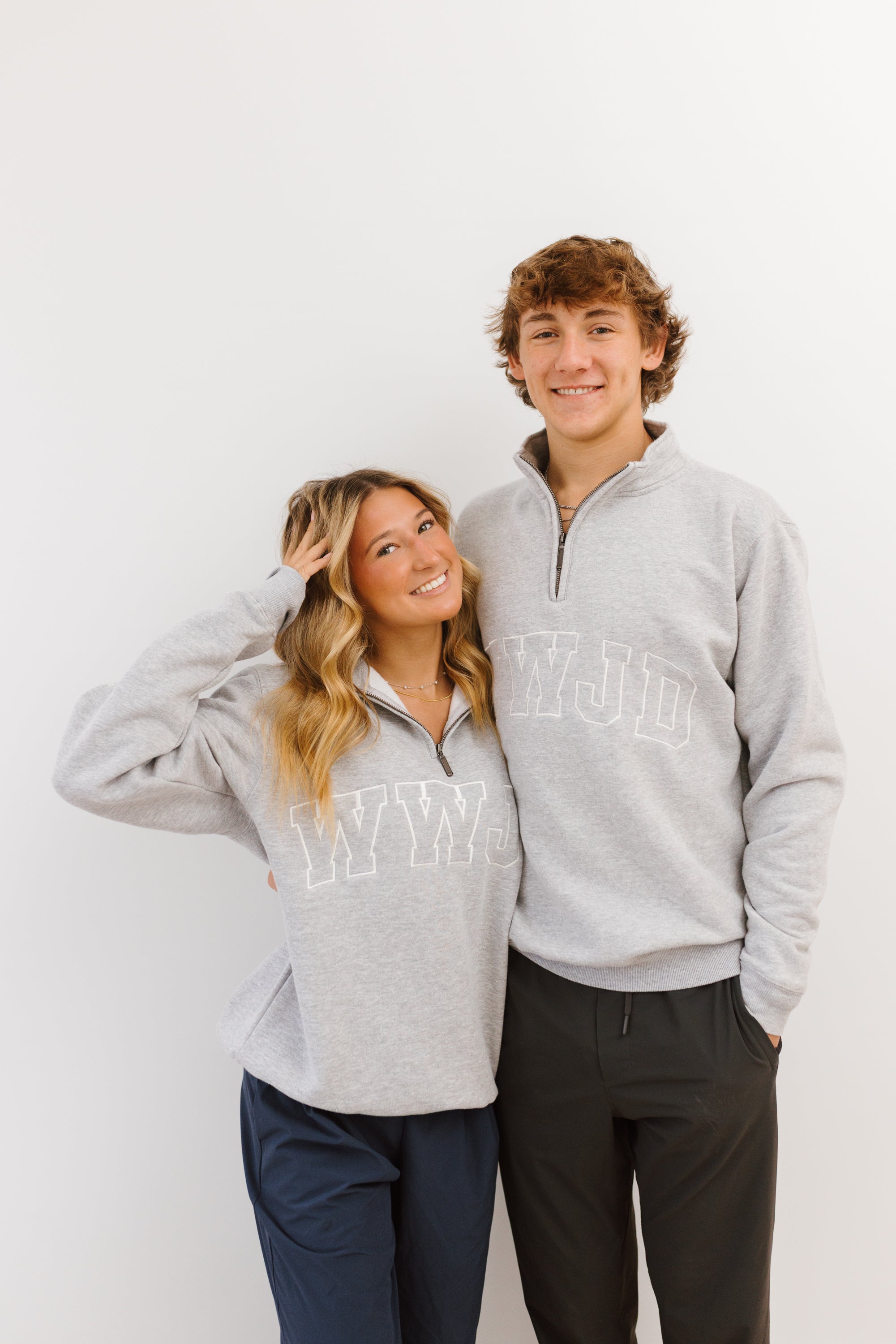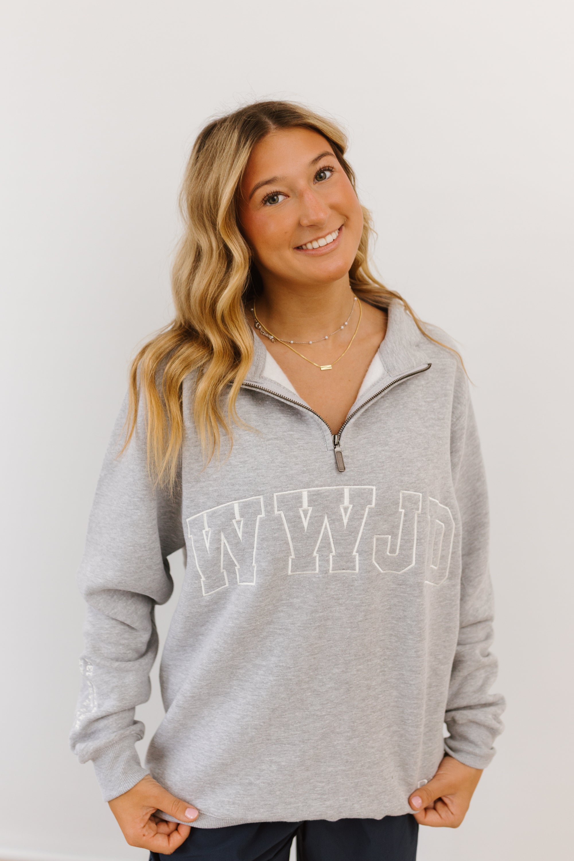 "WWJD" in white letters embroidered on front. Embroidered RYZN logo on bottom of hoodie in light blue, with a the verse "I will never leave you nor forsake you" embroidered on sleeve with HEBRREWS 13:5 below the verse.